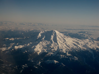 Taxing out to the runway: The Olympic Mountains. Mount Rainier.