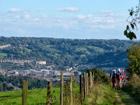 People enjoying the nice October weather by hanging out in front of the Royal Crescent. Hot air balloon flying over St. Swithin's Church.